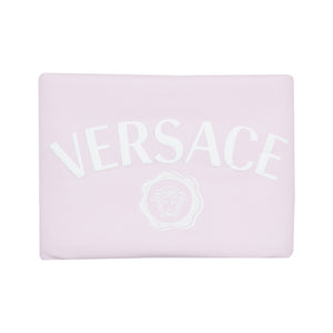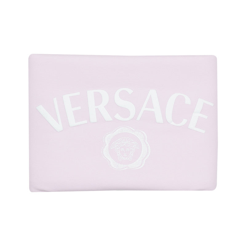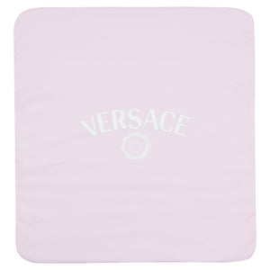 This pale pink and ivory blanket for baby girls by Italian designer Versace, combines comfort with luxury style. Made in soft cotton jersey and lightly padded for warmth, it is ideal for use in the pram and when out and about. The front features a raised white logo and signature Medusa, whilst the back is plain ivory.