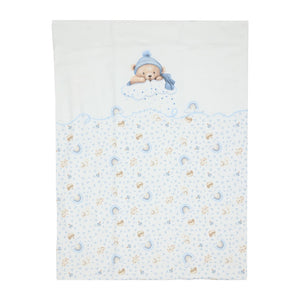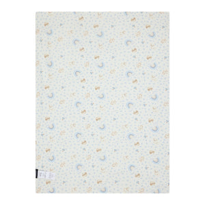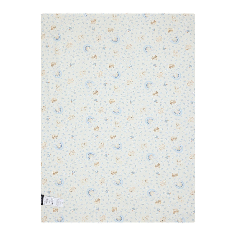 This lovely ivory and blue blanket by Monnalisa, is made in soft cotton jersey. Lightly padded, one side features an adorable teddy bear and cloud motif, along with a delightful pattern of rainbows, dummies and rattles.