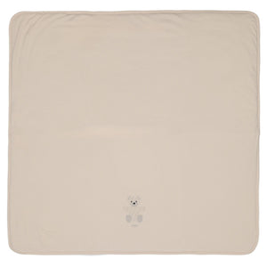 Beige blanket for baby boys and girls by luxury Italian brand Fendi, made in soft cotton jersey. The front features an adorable Fendi bear motif, patterned with signature FF logo detailing, with a matching, all-over FF logo pattern on the reverse.