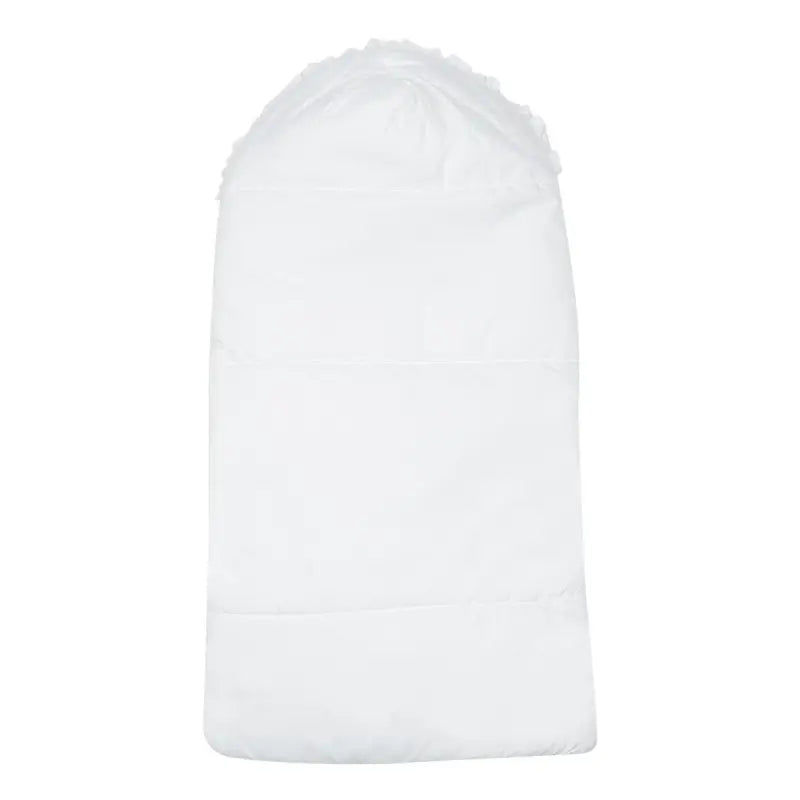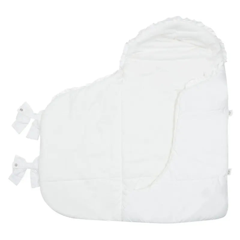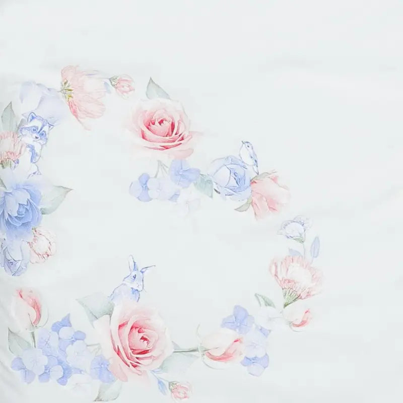 White silky satin nest by Lapin House, with a beautiful pale pink and blue print of flowers, birds and bunnies. In a wrap-around style with frilly satin trims, it is warmly padded and lined in soft, comfortable cotton jersey. The nest has popper-fastening straps on one side, with pretty fixed bows on top.