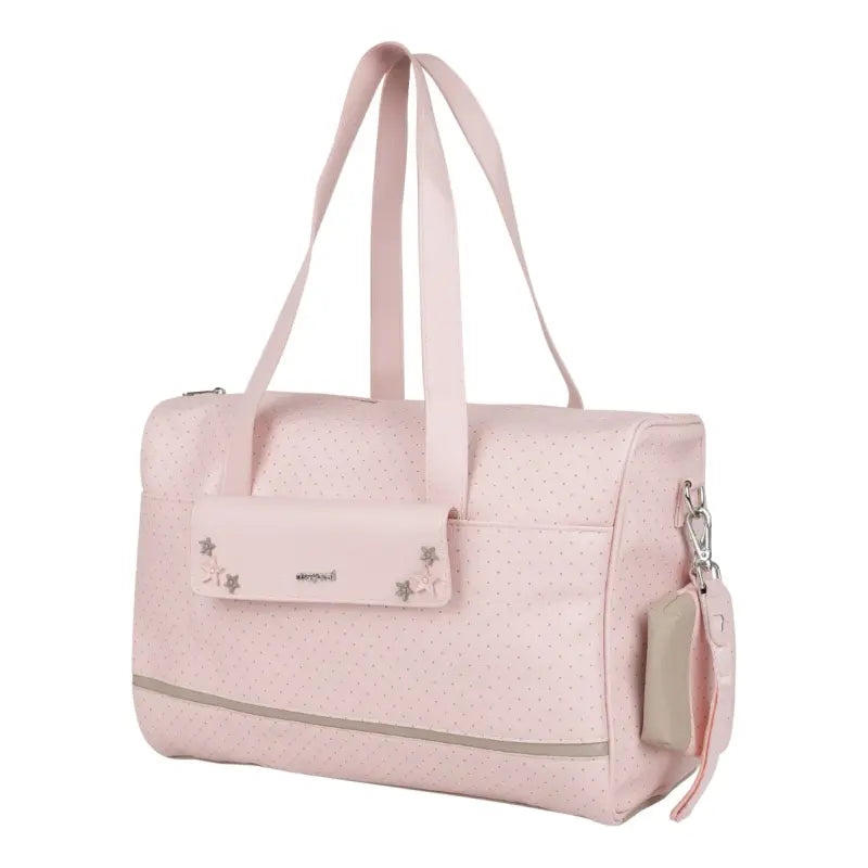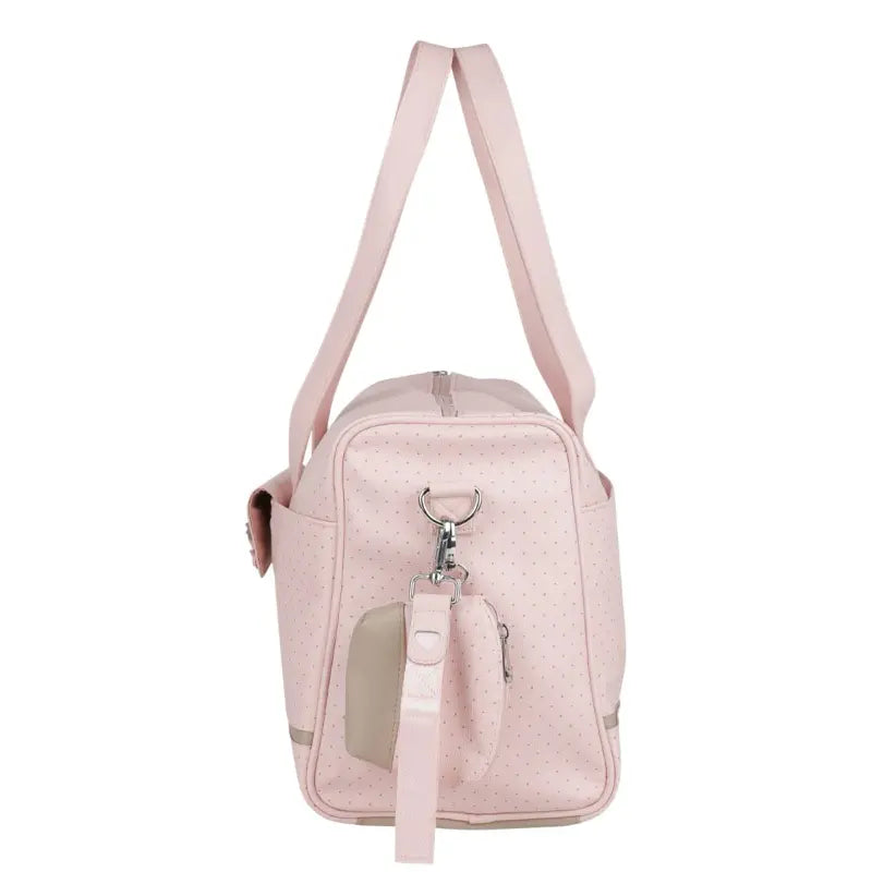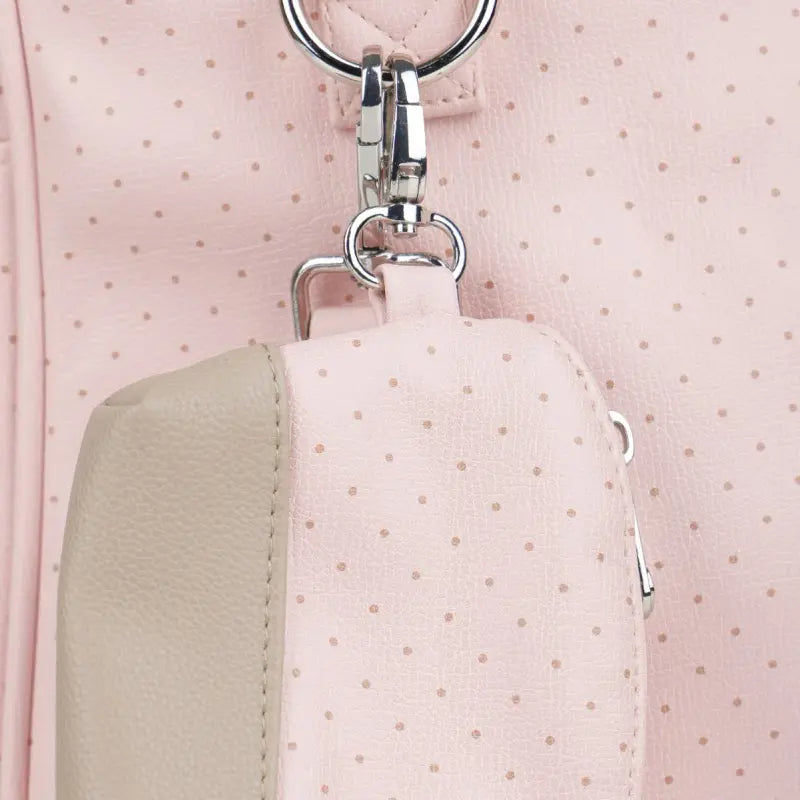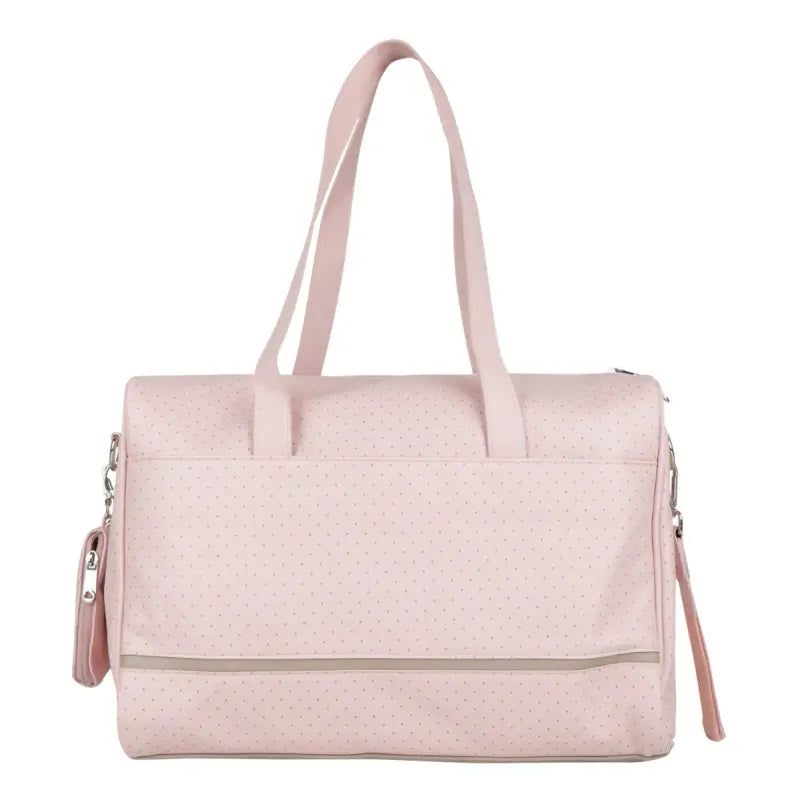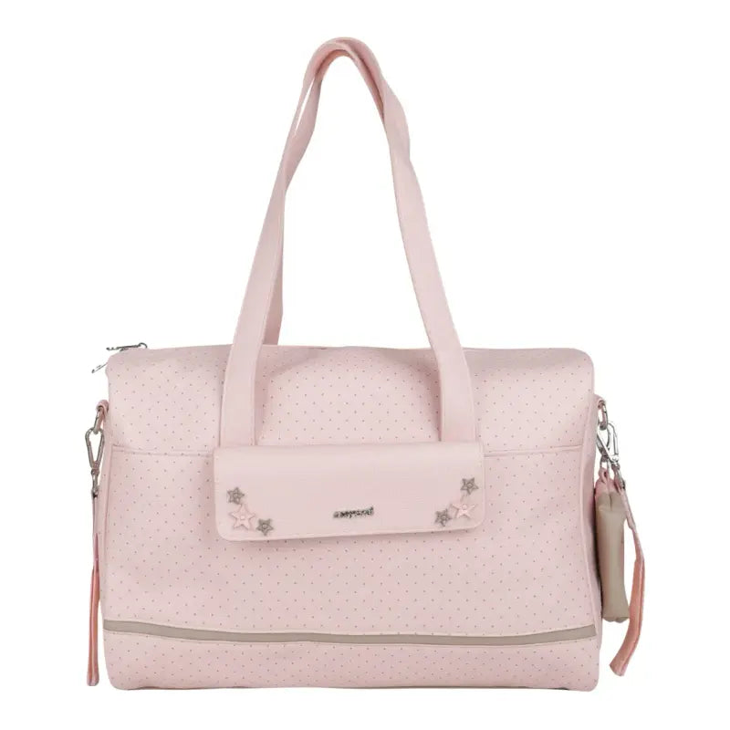 Pink baby changing bag by Mayoral. Made from soft faux leather with beige trims. Has two carry handles and an adjustable removeable strap and stroller strap. There are pockets on the outside and inside to store essentials and a zip closure for the main compartment.
