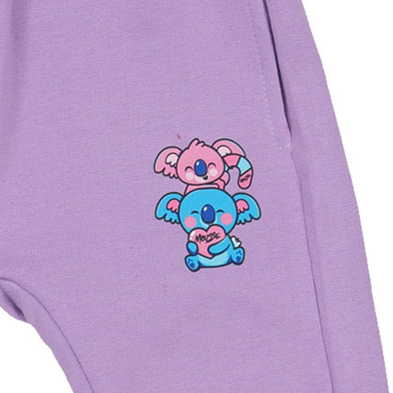 Super cozy lilac purple joggers featuring cuffed ankles and a cheerful stacked koala graphic. The soft fleece fabric ensures all-day comfort for playtime.