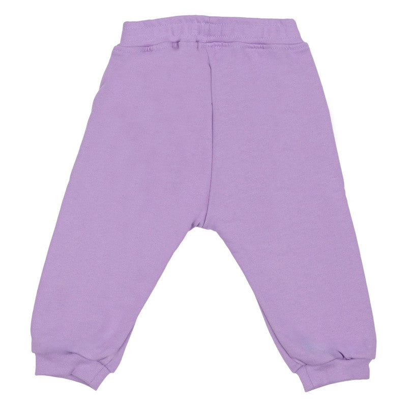 Super cozy lilac purple joggers in a relaxed fit with cuffed ankles. The hip features an adorable teddy bear graphic, perfect for comfortable playtime.