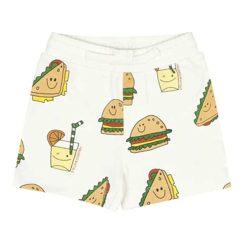 Ivory shorts for baby boys and younger boys by Stella McCartney. Made from soft organic cotton. Features an all-over sandwich and lemonade print pattern. It has patch pocket at the back and an elasticated waistband and drawstring for comfortable fit.