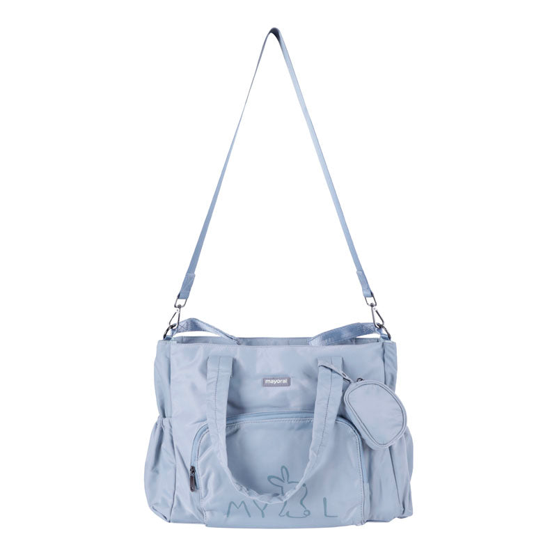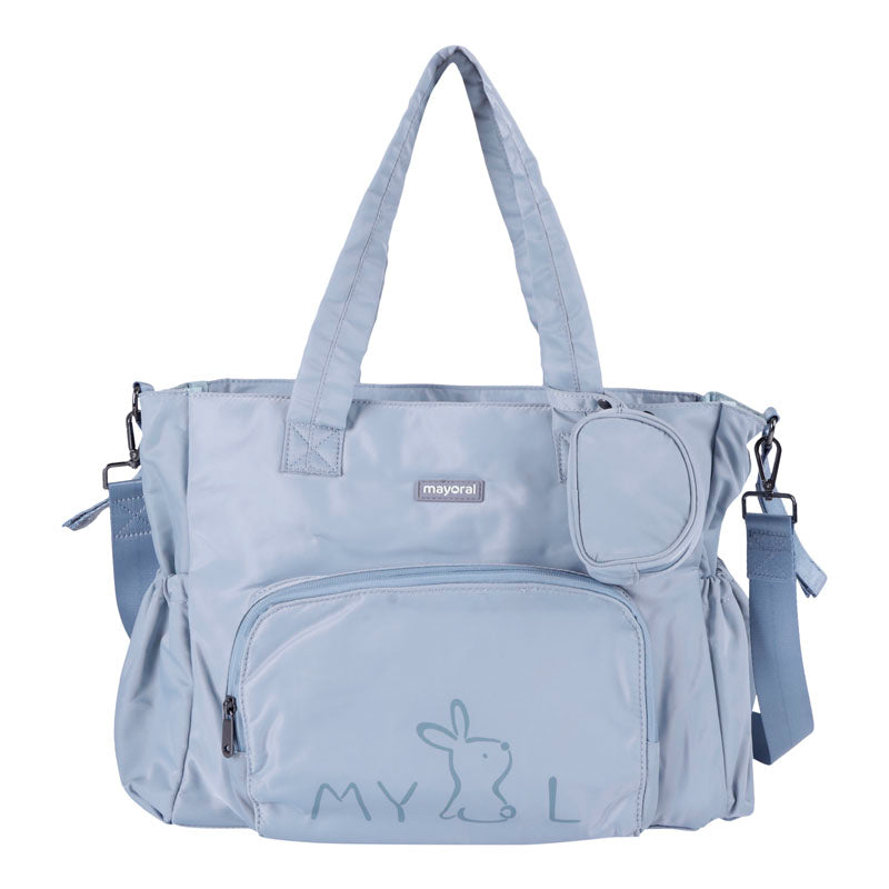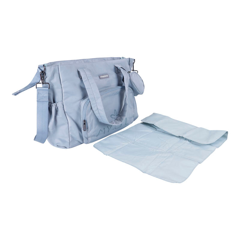 Changing bag with matching dummy holder. This is a complete set used to carry everything you need to look after your baby. It includes a long, detachable strap for use as a shoulder strap and is a very versatile bag. This item incorporates detachable hanging straps, which can be easily attached to your baby´s pram. Functional front pocket. This item comes with a nice bag to match the garment.