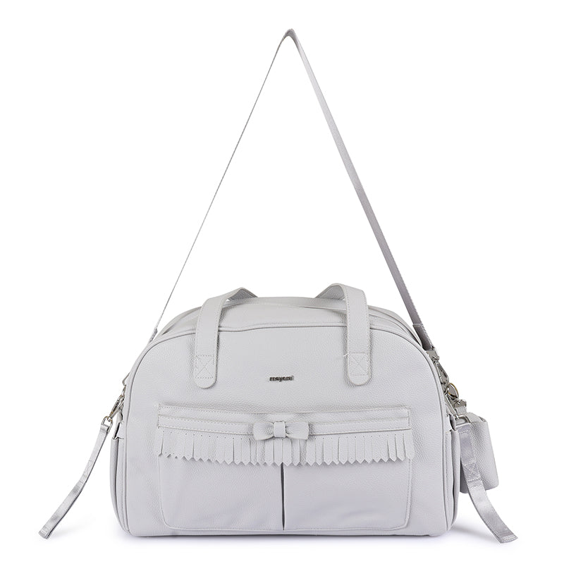 Changing bag with matching dummy holder. This is a complete set used to carry everything you need to look after your baby. Zip fastening. It includes a long, detachable strap for use as a shoulder strap and is a very versatile bag. This item incorporates detachable hanging straps, which can be easily attached to your baby´s pram. This item comes with a nice bag to match the garment. Dimensions: 31 cm High x 45 cm Wide.
