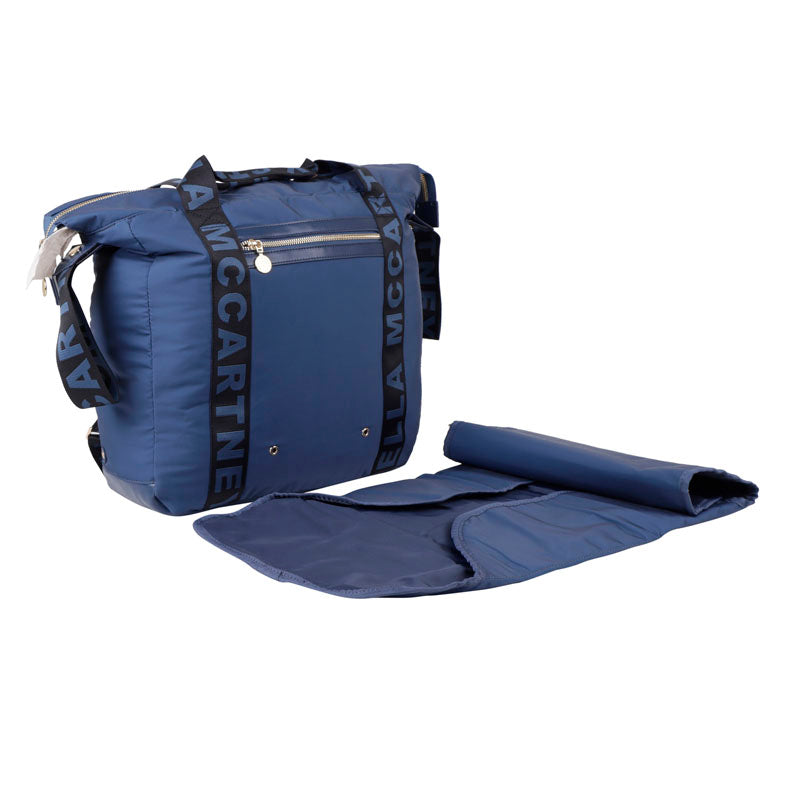 Navy blue and black changing backpack from Stella McCartney Kids. Emblazoned with the brand's logo, this design features a two-way zip fastening, two half-round handles, adjustable shoulder straps, gold-tone metal hardware, side tabs to attach the item to a stroller, and one internal compartment with multiple pockets. It is also equipped with a changing table with snap closures.