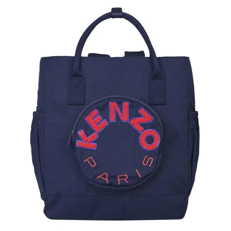 A navy blue canvas baby changing bag from KENZO KIDS, designed with distinctive red logo accents. Functional yet stylish, it has a zip-up circular pocket on the front and elasticated side pockets to keep essential items on hand. It has a spacious main compartment that closes with a zip and is fitted with pockets for added organisation.
