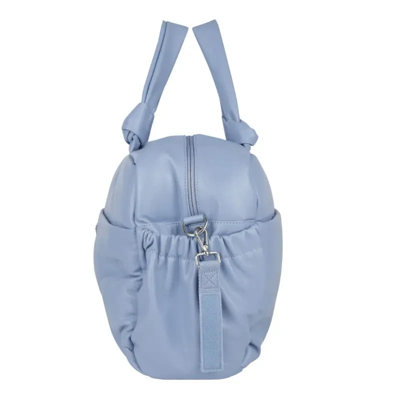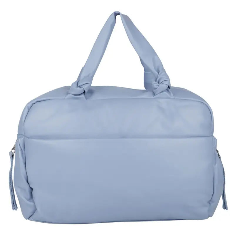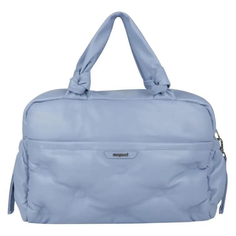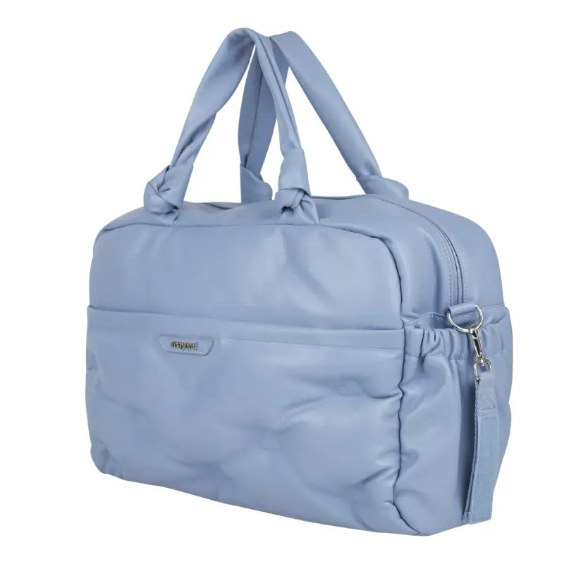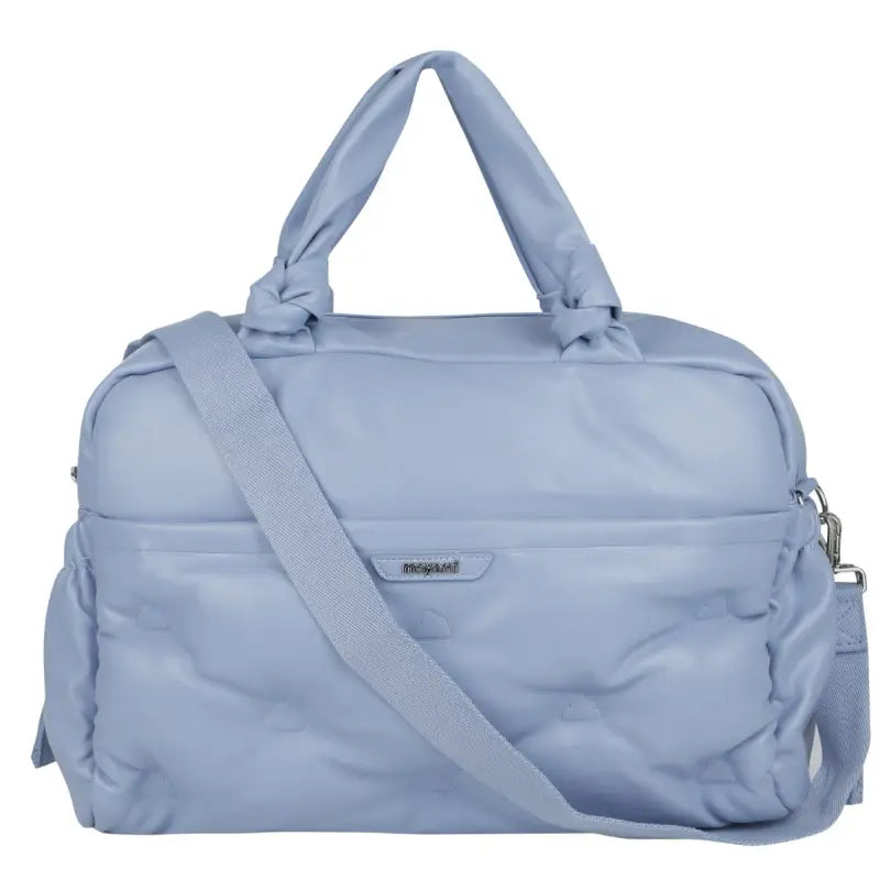 Blue zip-up changing bag by Mayoral, with silver-coloured hardware. Soft and durable, this faux leather bag has multiple inner and outer pockets, some of which fasten with poppers and zips, for neat and tidy storage. One side is embossed with clouds and detailed with a logo patch.