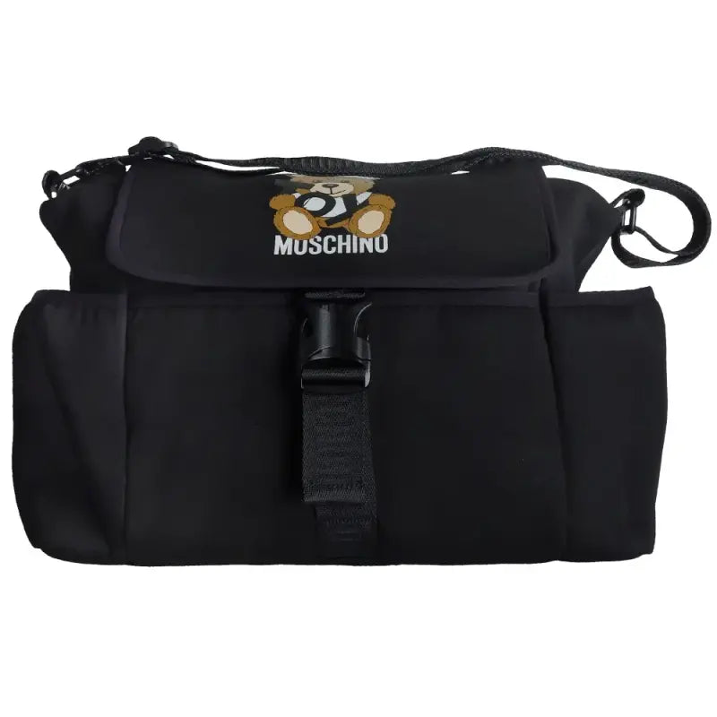 The Moschino Kids Teddy-logo changing bag in Black is crafted from a cotton blend and features the signature Teddy Bear motif and front logo print. Designed with an adjustable shoulder strap, foldover top with buckle fastening, and a spacious main compartment. Includes a cozy fleece changing mat for added convenience.