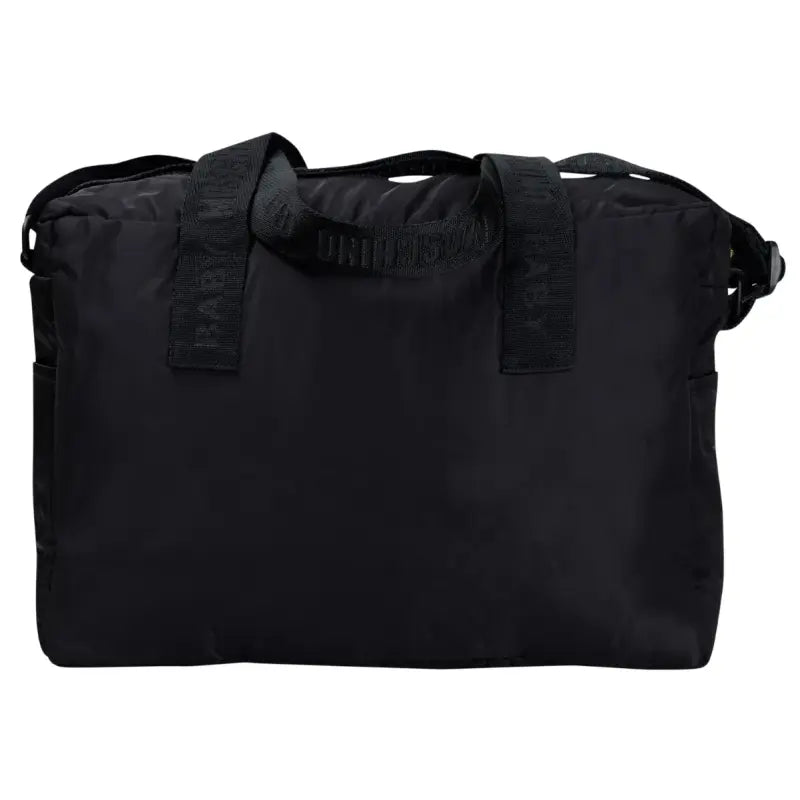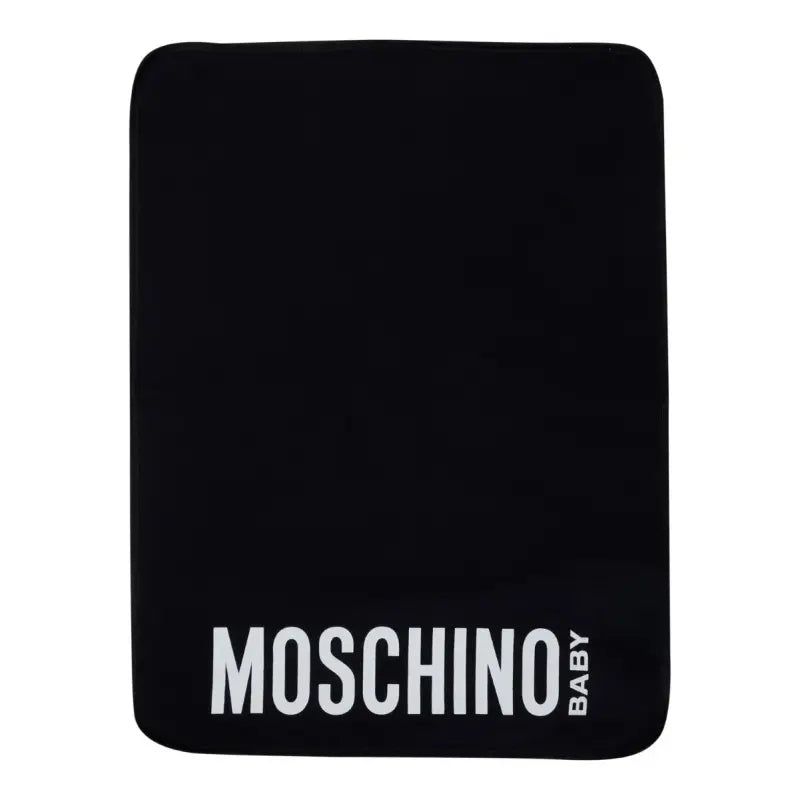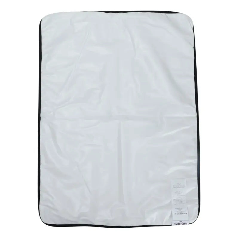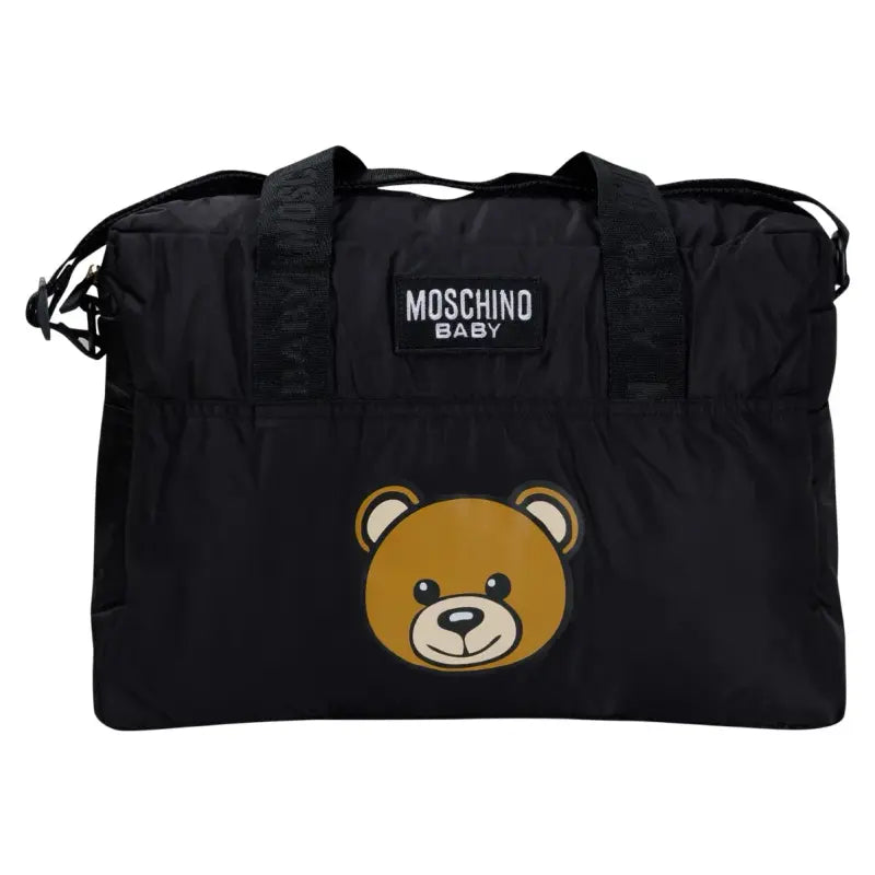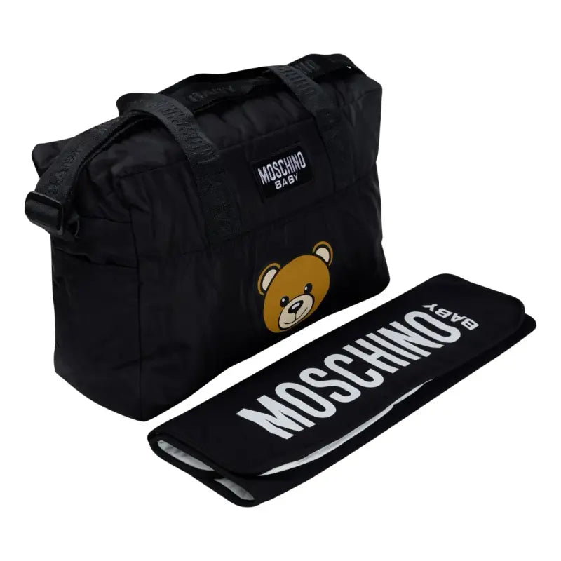 This Moschino changing bag features a playful Moschino Teddy Bear patch on the front and is designed with double handles for shoulder carry and an adjustable shoulder strap for crossbody wear. It includes two side pockets for added convenience, a secure zip closure, and a waterproof fabric lining. The bag also offers inner pockets for organized storage and comes with a matching fleece changing mat for on-the-go diaper changes.