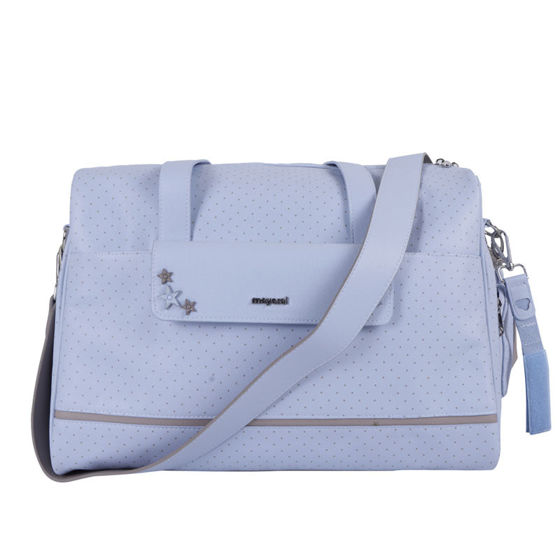 This charming changing bag from Mayoral is as stylish as it is practical. It even comes with a matching dummy holder! The baby blue colour will look fab for a boy or a girl. Features include zip fastening with a wipeable leatherette exterior, perfect for spills. It includes hanging straps to attach onto your pram and another long strap for your shoulder. Decorative elements include metallic appliques, contrasting coloured details, glitter. This bag is designed to match with other Mayoral products.