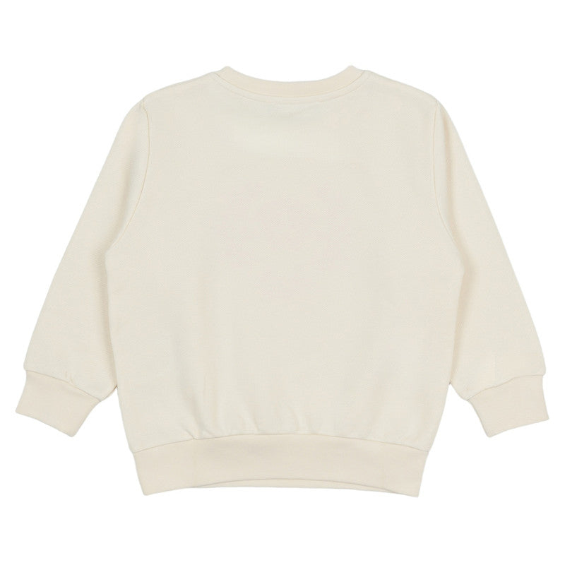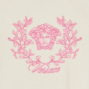 Ivory sweatshirt by luxury label Versace, combining casual style with an iconic designer touch. It is made in mid-weight cotton jersey, with dropped shoulders for a relaxed feel. A Medusa logo with beautiful floral detailing is embroidered on the front in a vibrant pink, with shimmery sequins for added sparkle.