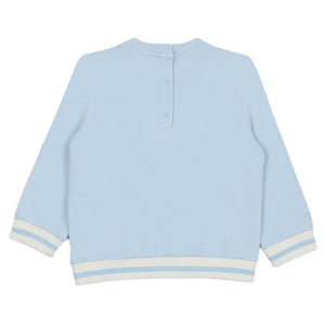 Light Blue sweatshirt by luxury brand Fendi, made in soft cotton jersey. Combining playful charm with comfort, it has a delightful Fendi bear motif on the chest and signature Fendi Roma embroidery on one sleeve. There are sporty striped trims and useful popper fastenings on the back to help with dressing.