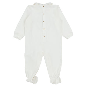 Stylish off-white babygrow for boys and girls by Versace, featuring the brand's iconic Medusa motif in striking metallic print. Made from soft cotton jersey, it has a classic Peter Pan collar and fastens with branded gold poppers to complete the look.