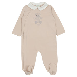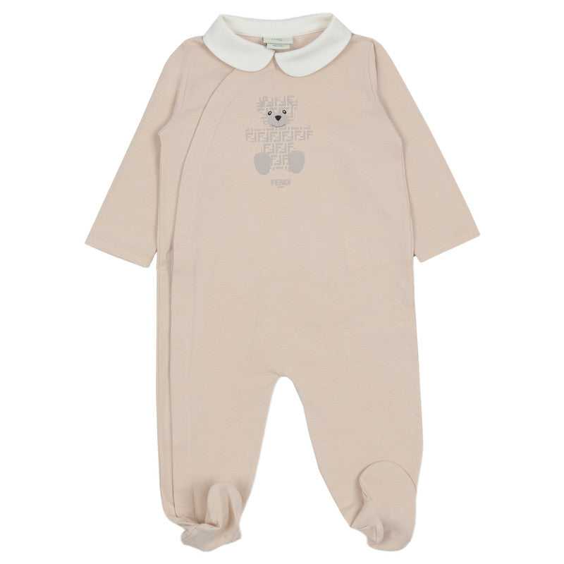 This beige babygrow set by Fendi features a charming bear motif adorned with the signature FF logo. Including a babygrow, hat, and bib, each piece is made in soft cotton jersey, ensuring all-day comfort. The babygrow has a white Peter Pan collar and concealed front popper fastenings for easy wear. The matching hat has a turned-up brim and the bib has an absorbent towelling lining. All pieces are printed with the designer's logo for instant brand appeal.