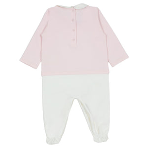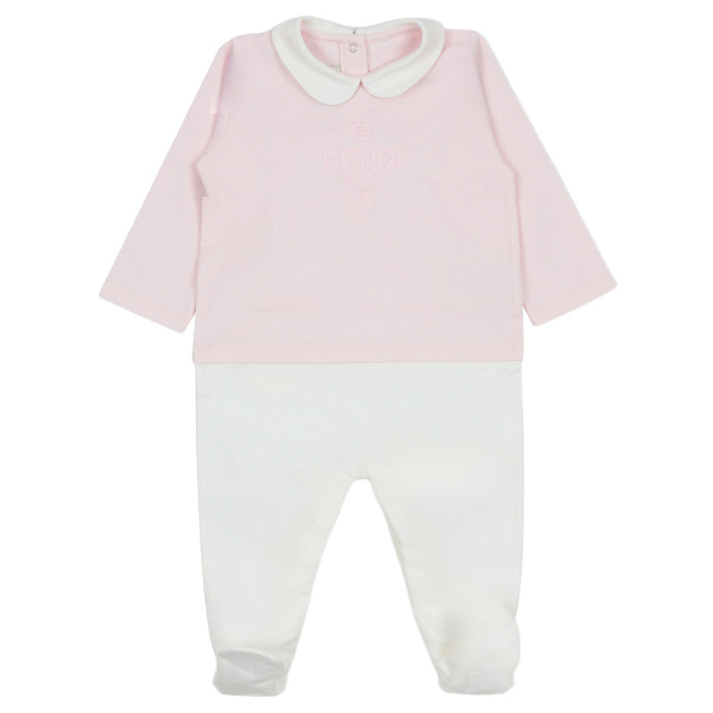 A charming three-piece Fendi baby set in pink and white. Includes a collared all-in-one, beanie hat, and bib, all featuring the signature Fendi logo.