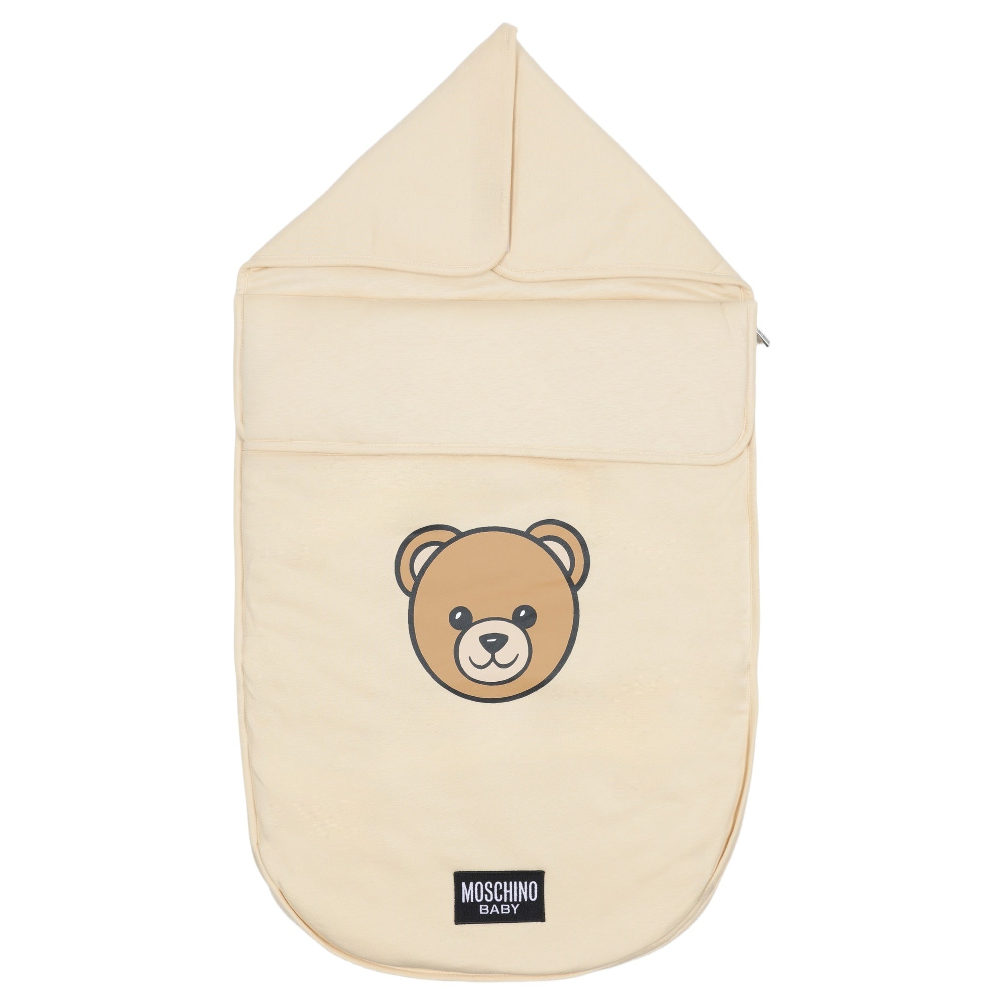 This Cozy Beige Padded Sleeping Bag From Moschino Is Designed To Keep Your Little One Snug And Comfortable. It Features A Charming Teddy Bear Print On The Front And A Convenient Zipper Closure For Easy Access. Perfect For Naps Or On-The-Go Travel, This Sleeping Bag Is A Sweet And Practical Accessory