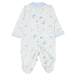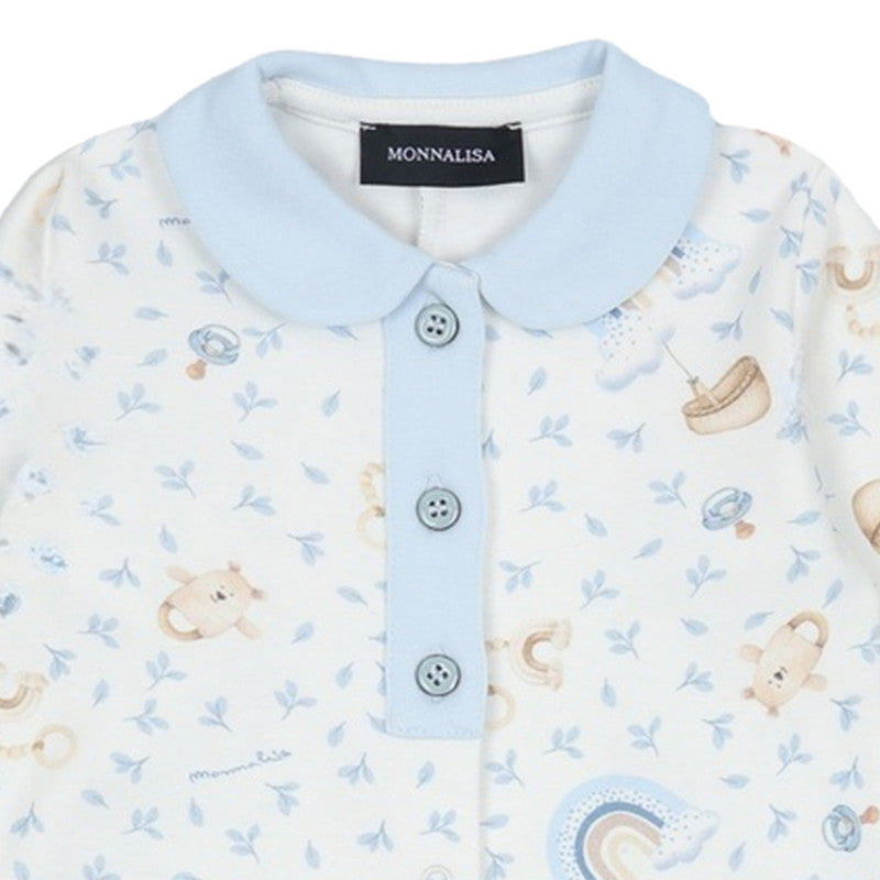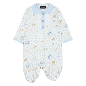 A cute ivory babygrow by Monnalisa, made in soft, comfortable cotton jersey. Classically styled with a blue collar and buttons, it has an adorable teddy bear and rainbow print in soft blue accents. There are practical popper fastenings for easy dressing.