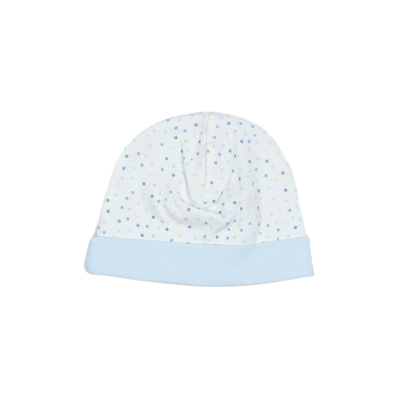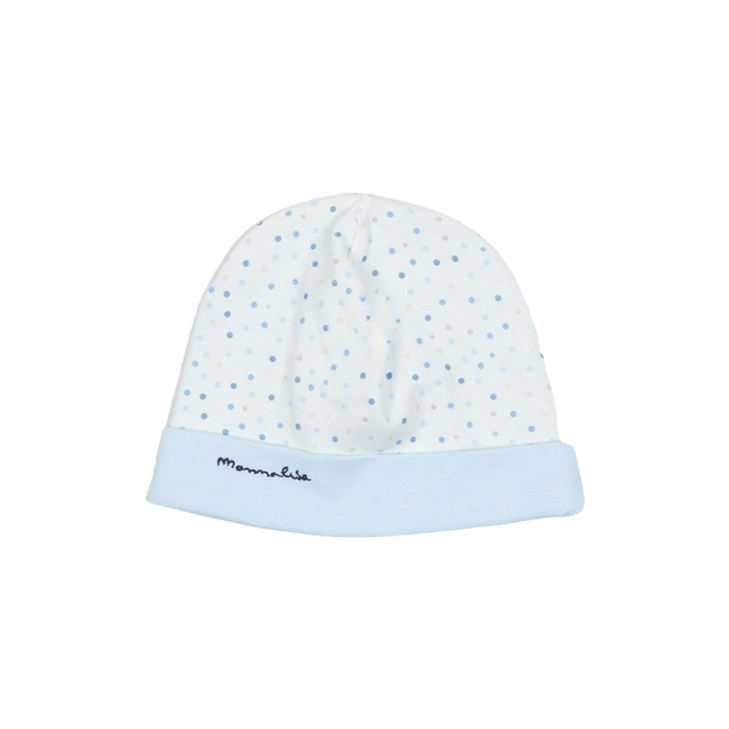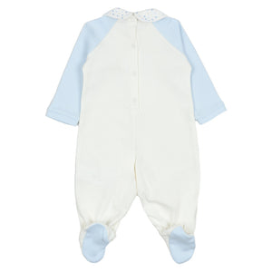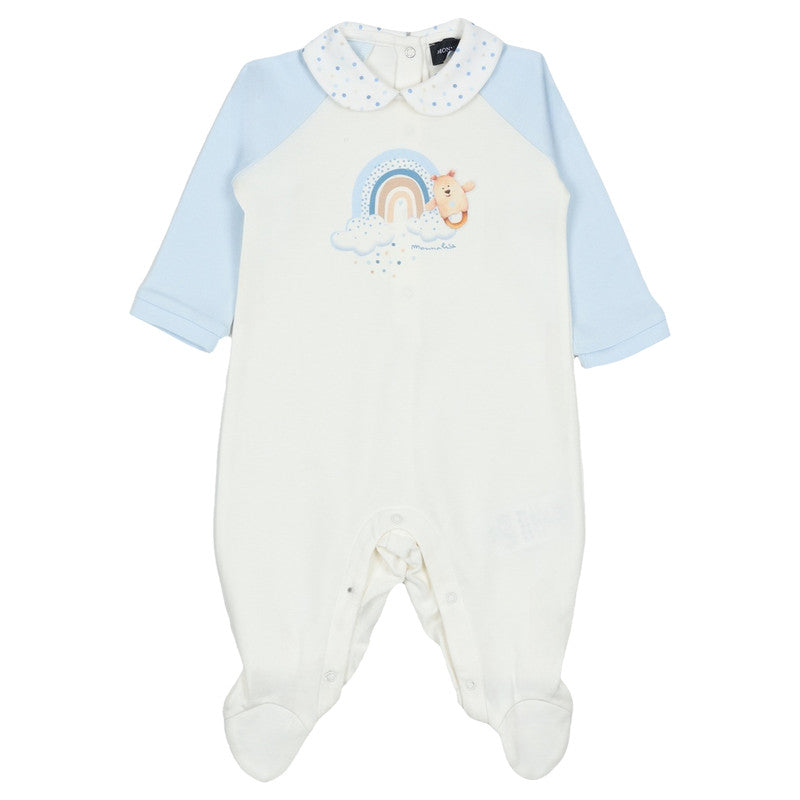 A lovely white and blue babysuit set by Monnalisa, made in soft cotton jersey. The babygrow has a sweet rainbow and bear motif on the front, complemented by a polka-dot patterned Peter Pan collar. It fastens easily with poppers. The set also includes a matching bib with an absorbent towelling lining, ideal for little spills, and a coordinating layette hat with an embroidered logo for designer appeal.