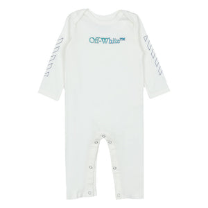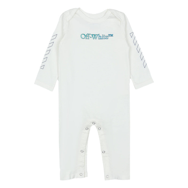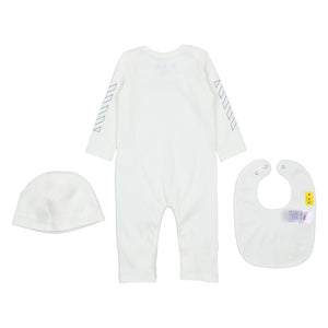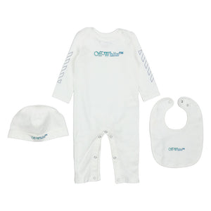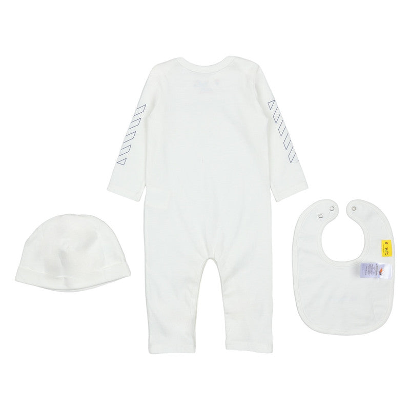 This adorable Off-White set, featuring a onesie, hat, and bib in crisp white with a blue logo, is the perfect premium gift for a fashion-forward newborn.
