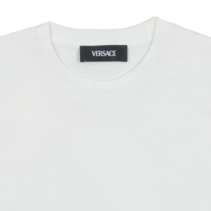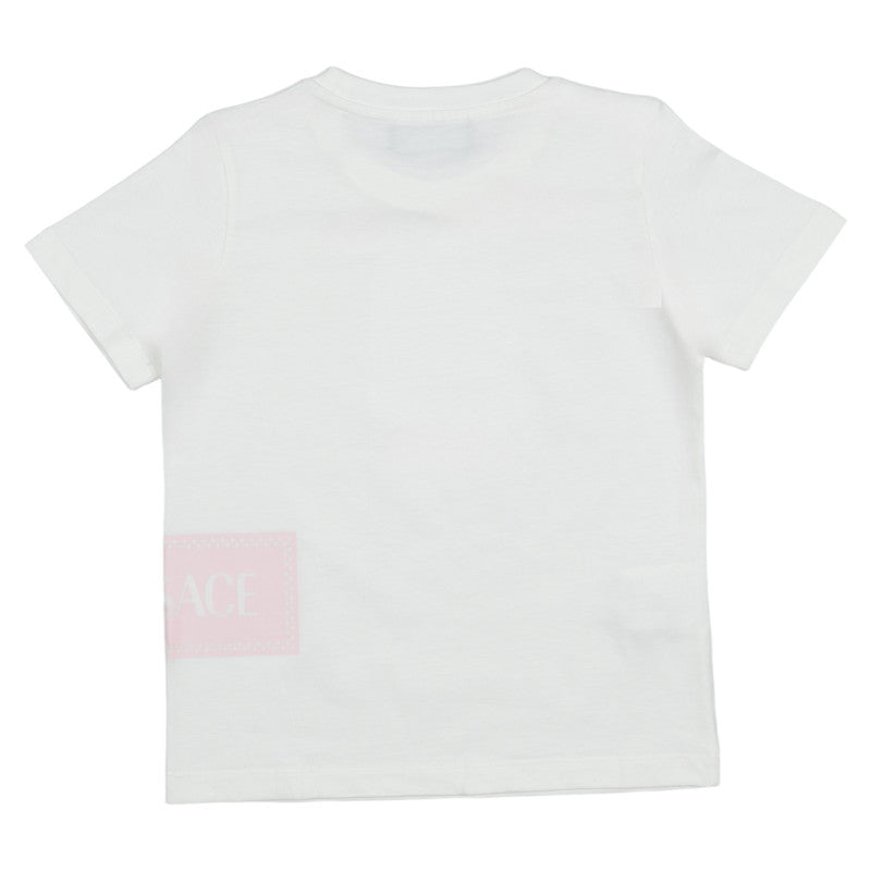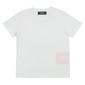 White T-shirt by luxury Italian label Versace, made in soft cotton jersey. This casual tee has a pastel pink 9's Vintage Logo printed on the one side for instant brand appeal.