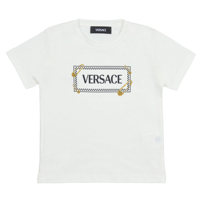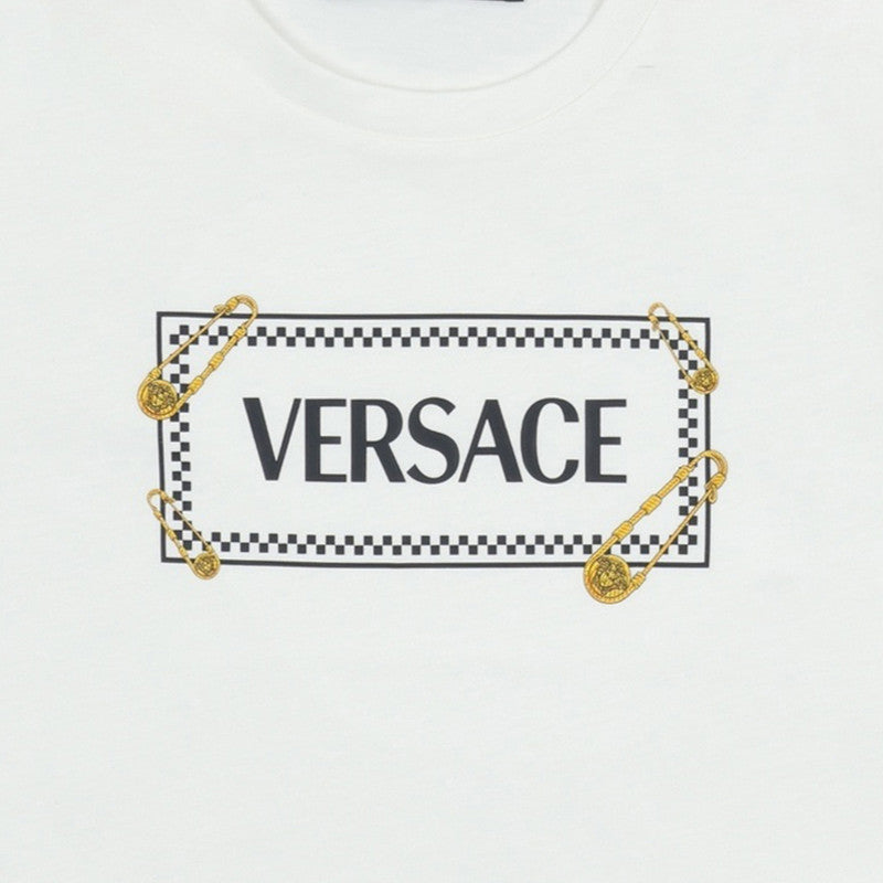 Unmistakably by the brand, this white cotton T-shirt by luxury designer Versace has the label's bold Safety Pin logo print in black, with gold Medusas. Made in soft, comfortable jersey, it adds style to casual days.
