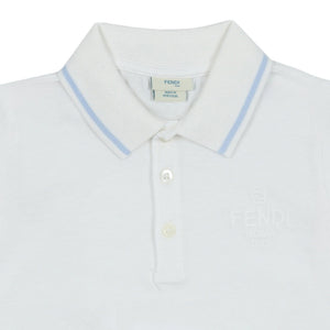 Classic white polo shirt for little boys by Fendi, made in soft cotton jersey. It features a single pale blue stripe on the ribbed collar and a branded button placket. For instant brand appeal, an embroidered logo crest can be seen on the chest, completing the luxurious look.