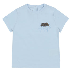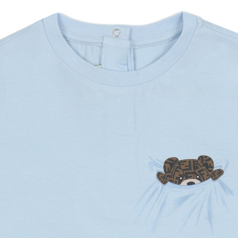 A delightful light blue T-shirt for baby girls by luxury label Fendi, made in soft cotton jersey. This casual piece has an adorable Fendi bear motif on the chest and signature Fendi Roma embroidery on one sleeve. There are popper fastenings on the back to help with dressing.