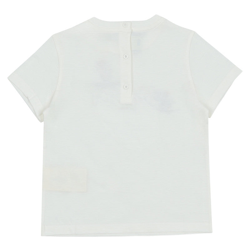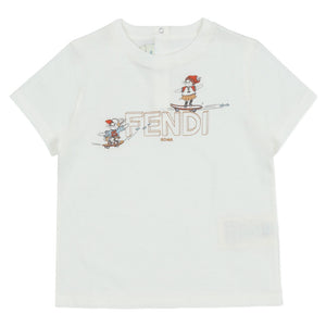 This playful white Fendi t-shirt features a unique graphic of animal mascots skateboarding across the FENDI logo. A cool and comfortable designer top.