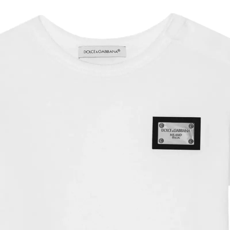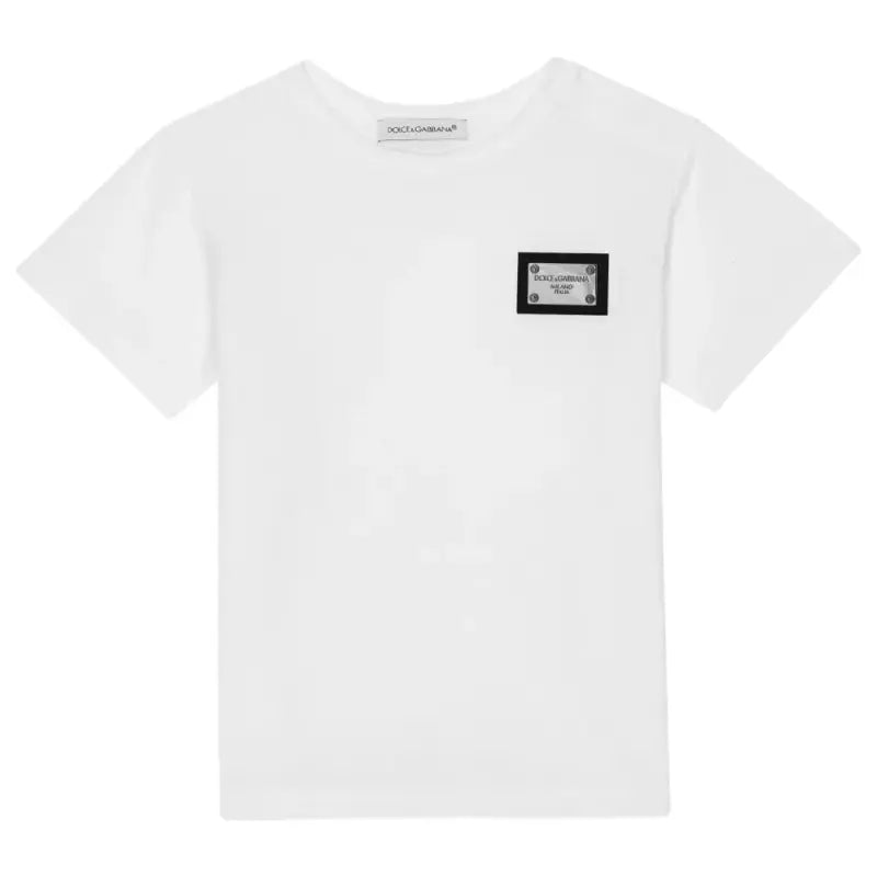 From luxury Italian label Dolce & Gabbana, a classic white T-shirt for. Made in comfortable cotton jersey, it has a logo plaque on the chest for a stylish designer touch. Concealed popper fastenings on one shoulder help with dressing.