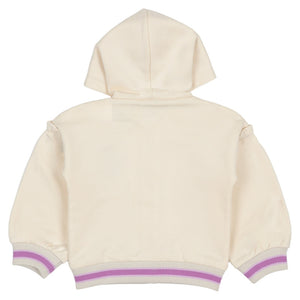 Effortlessly stylish in a casual look, this ivory hooded zip-up top for girls is from luxury Italian brand Dolce & Gabbana. Made in soft, loop-back cotton jersey, the chest features an exquisitely embroidered purple floral appliqué and the iconic DG logo. This comfortable layer is designed in a relaxed fit with dropped ruffle shoulders and contrasting lilac stripes.