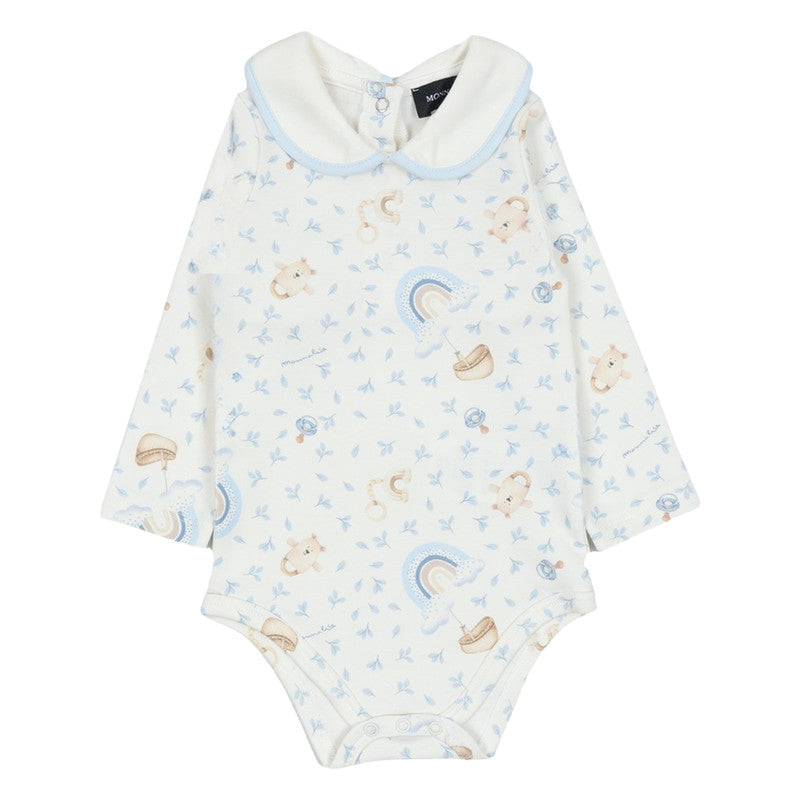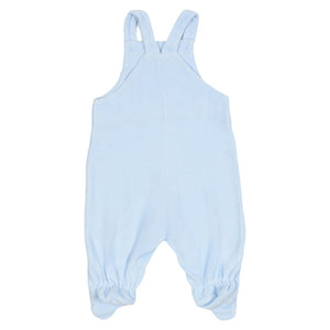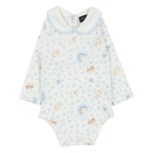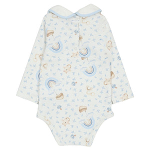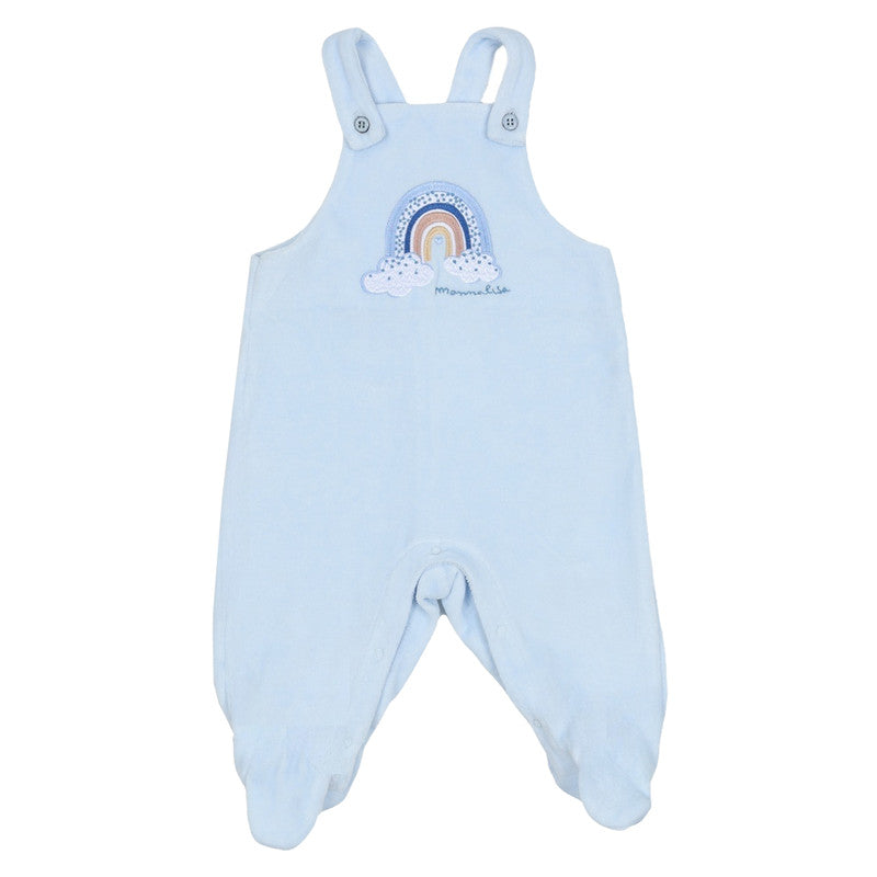 A cute cotton babygrow set by Monnalisa, in ivory and pale blue. Made in soft, comfortable jersey, the bodysuit has a sweet rainbow and teddy bear rattle print, with popper fastenings between the legs so it always stays neat and tidy. The velour dungarees have a lovely embroidered rainbow design on the front and button-fastening shoulder straps.
