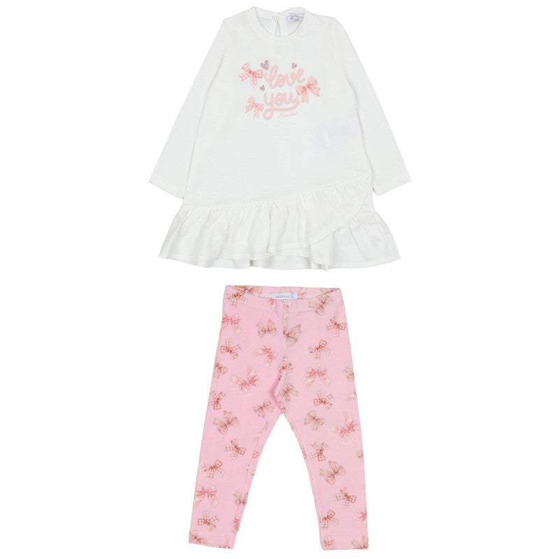 Monnalisa Ivory & Pink Cotton Bow Leggings Set