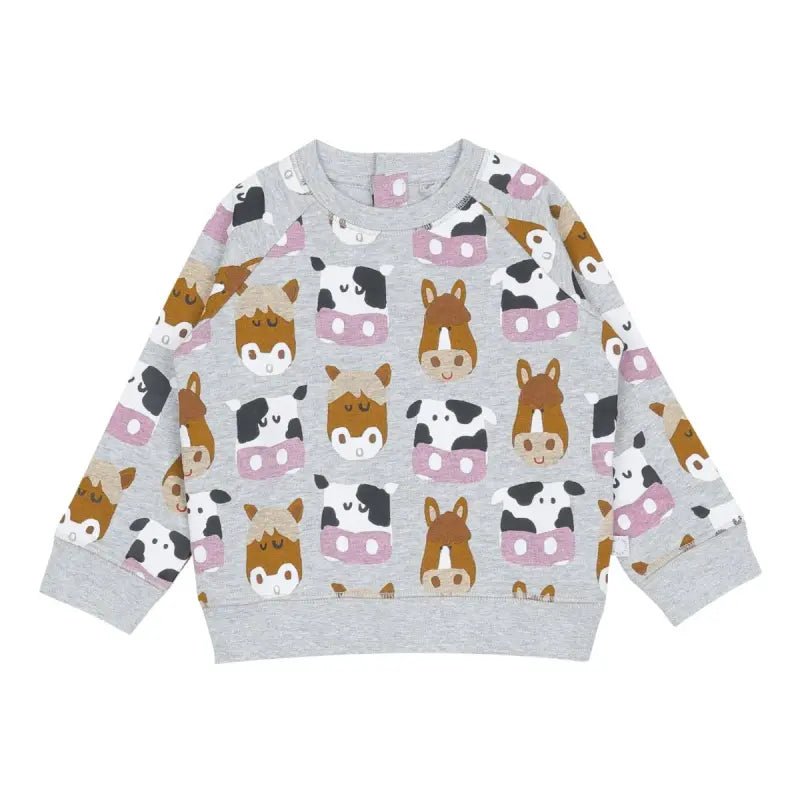 Featuring a fun farm animal print of horses and cows, this grey marl tracksuit for little boys is by Stella McCartney Kids. Casual and comfortable, it is made in soft organic cotton jersey with a cosy fleecy inside. The top fastens with poppers on the back and the trousers have an elasticated drawstring waist for an ideal fit.