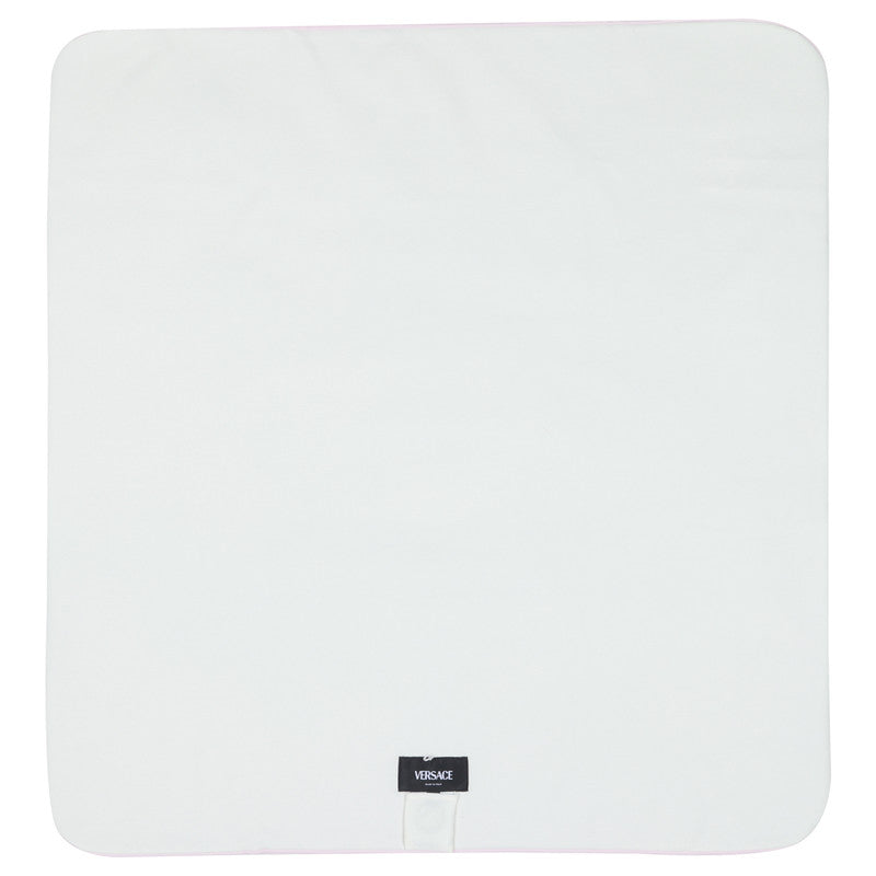This pale pink and ivory blanket for baby girls by Italian designer Versace, combines comfort with luxury style. Made in soft cotton jersey and lightly padded for warmth, it is ideal for use in the pram and when out and about. The front features a raised white logo and signature Medusa, whilst the back is plain ivory.