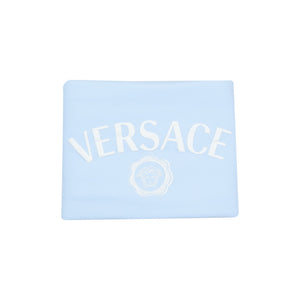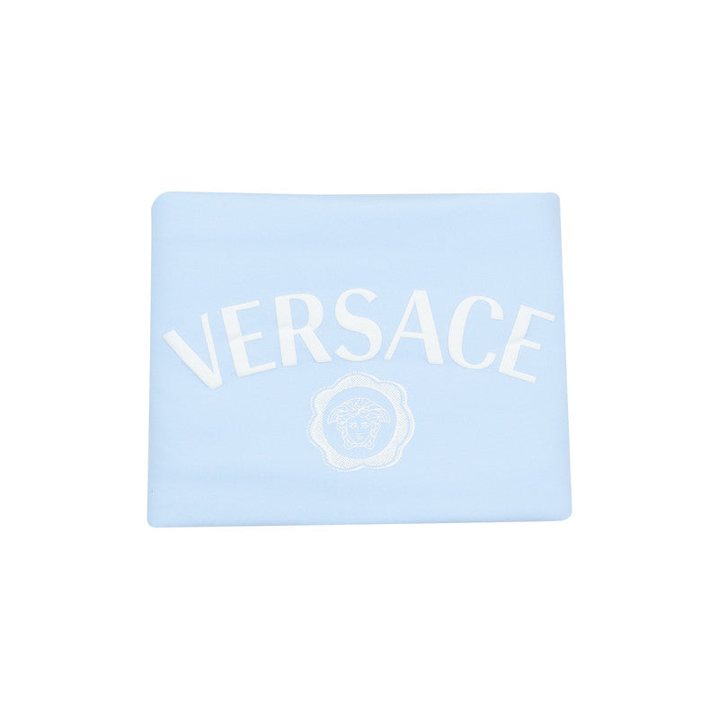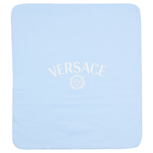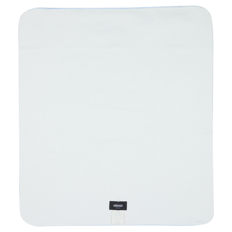 This blue and ivory blanket for baby boys by Italian designer Versace, combines comfort with luxury style. Made in soft cotton jersey and lightly padded for warmth, it is ideal for use in the pram and when out and about. The front features a raised white logo and signature Medusa, whilst the back is plain ivory.
