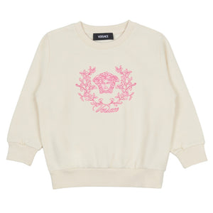 Ivory sweatshirt by luxury label Versace, combining casual style with an iconic designer touch. It is made in mid-weight cotton jersey, with dropped shoulders for a relaxed feel. A Medusa logo with beautiful floral detailing is embroidered on the front in a vibrant pink, with shimmery sequins for added sparkle.