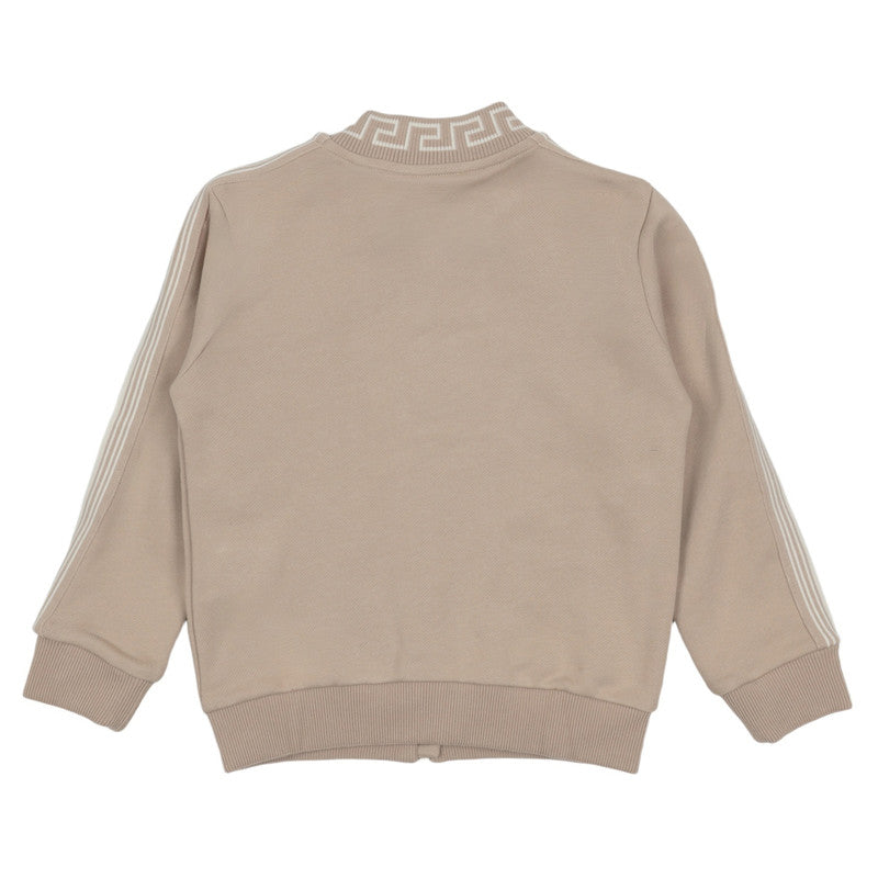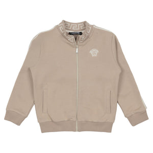 Beige zip-up top by luxury Italian label Versace, with the instantly recognisable Greca detailing on the ribbed collar. Made in soft mid-weight jersey, it has a sporty striped trim on the sleeves for a timeless casual look. With useful pockets on the front, a Medusa logo is embroidered on the chest for a signature finish.