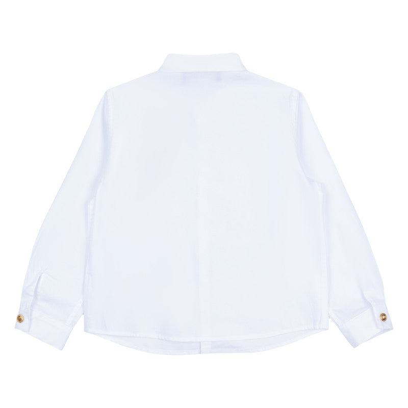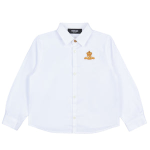 This long-sleeved Oxford cotton shirt features a thread-embroidered Versace Logo Crest motif at the chest and an accent Medusa button at the front closure.