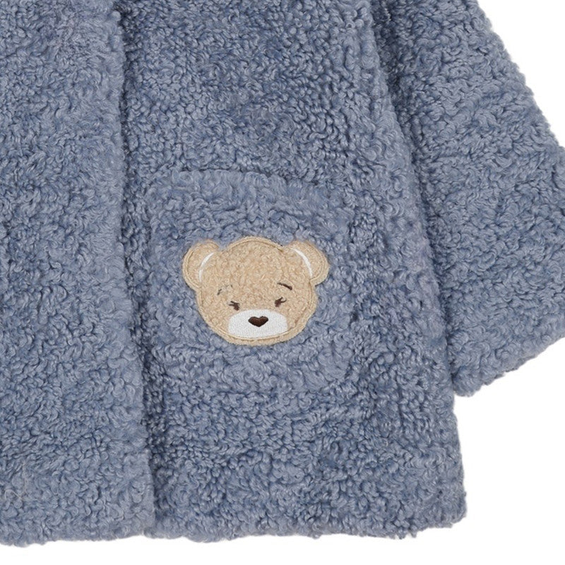 Warm and cosy in this blue hooded coat by Monnalisa, made in soft and fluffy teddy fleece. It has a silky satin lining and large concealed poppers for easy fastening. Cute teddy bear motifs on the patch pockets add a delightful touch.