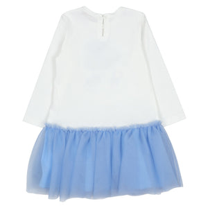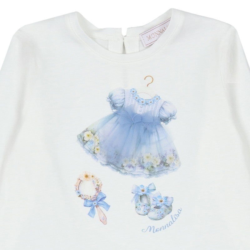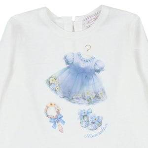 This lovely white and blue dress by Monnalisa, has a gathered tulle skirt for a sweet look. It is comfortably styled with a long-sleeved cotton jersey bodice, featuring a delightful motif of an elegant dress and shoes. A single button fastens neatly on the back.