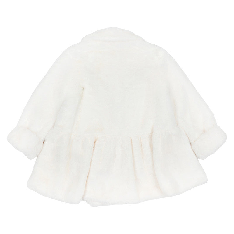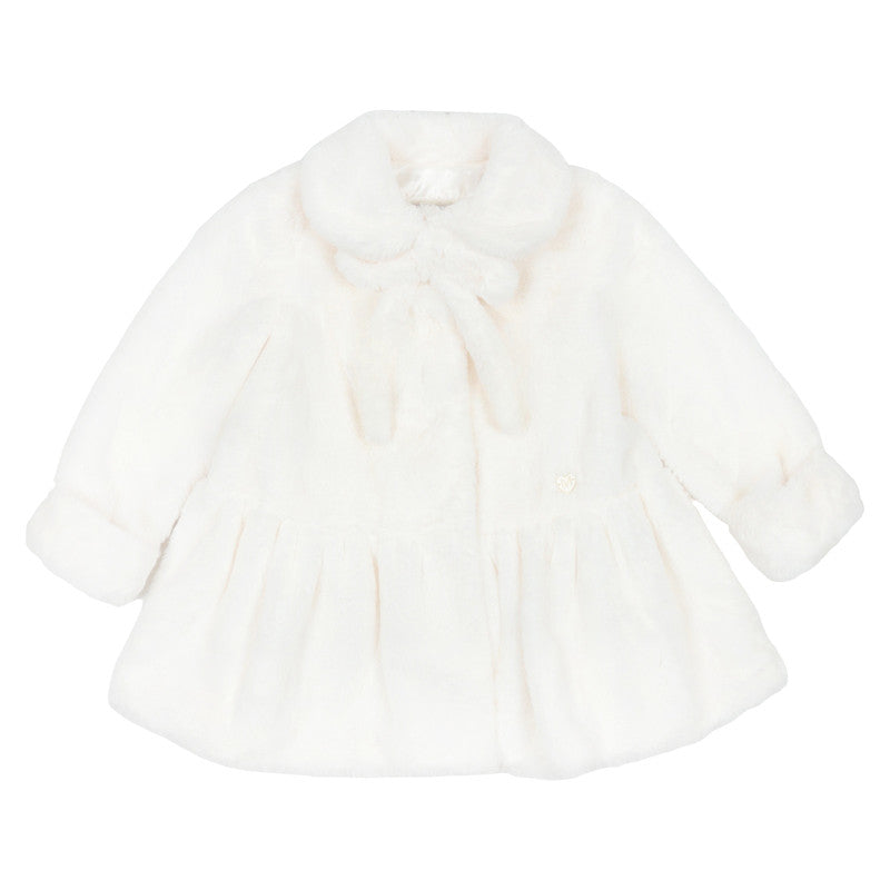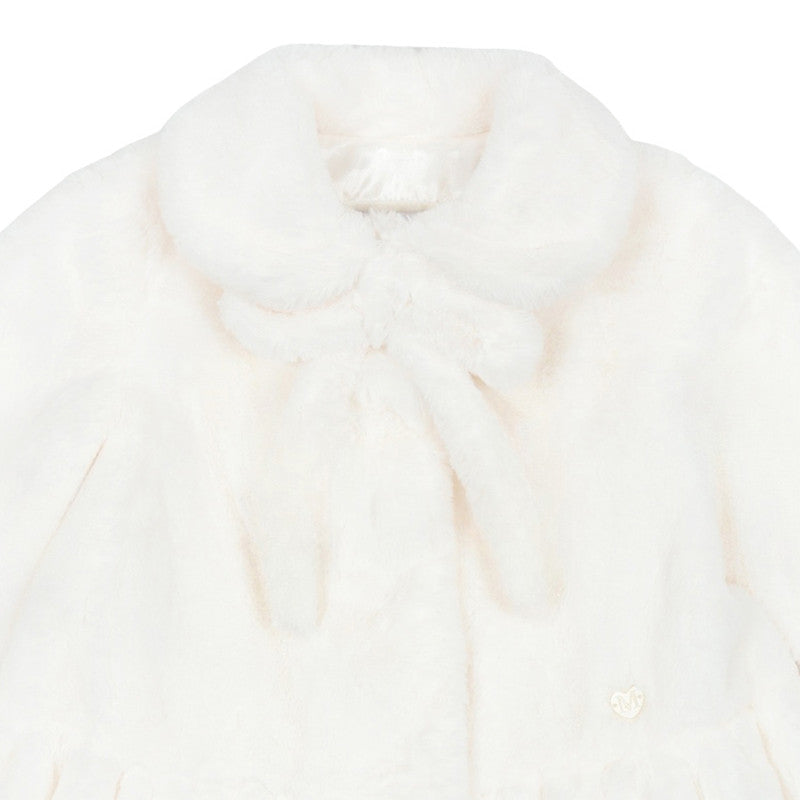 Ivory faux fur coat by Monnalisa exudes elegance and warmth, ideal during the colder months. Crafted with a plush, soft texture, this coat features a charming bow detail at the collar and a luxurious satin lining.