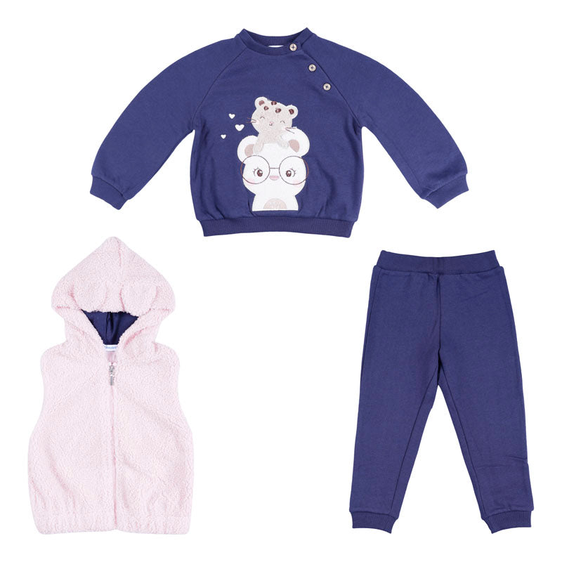 Three piece set for baby. Sleeveless gilet for baby. Front, central zip fastening. Long sleeved jumper for baby. Buttons fastenings on the shoulder. Trousers for baby from our sporty range, made with flexible material so they can be worn for playing and being active. 95% POLYESTER 5% COTTON