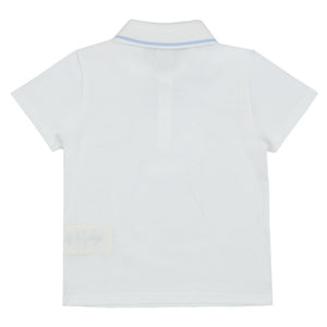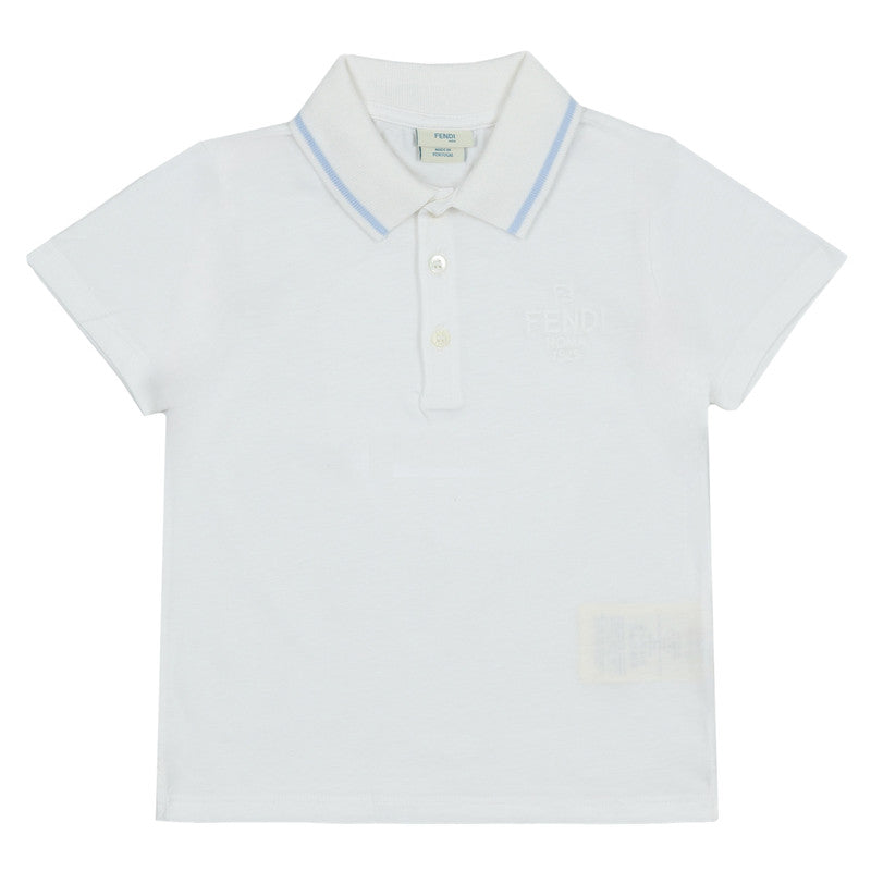 Classic white polo shirt for little boys by Fendi, made in soft cotton jersey. It features a single pale blue stripe on the ribbed collar and a branded button placket. For instant brand appeal, an embroidered logo crest can be seen on the chest, completing the luxurious look.