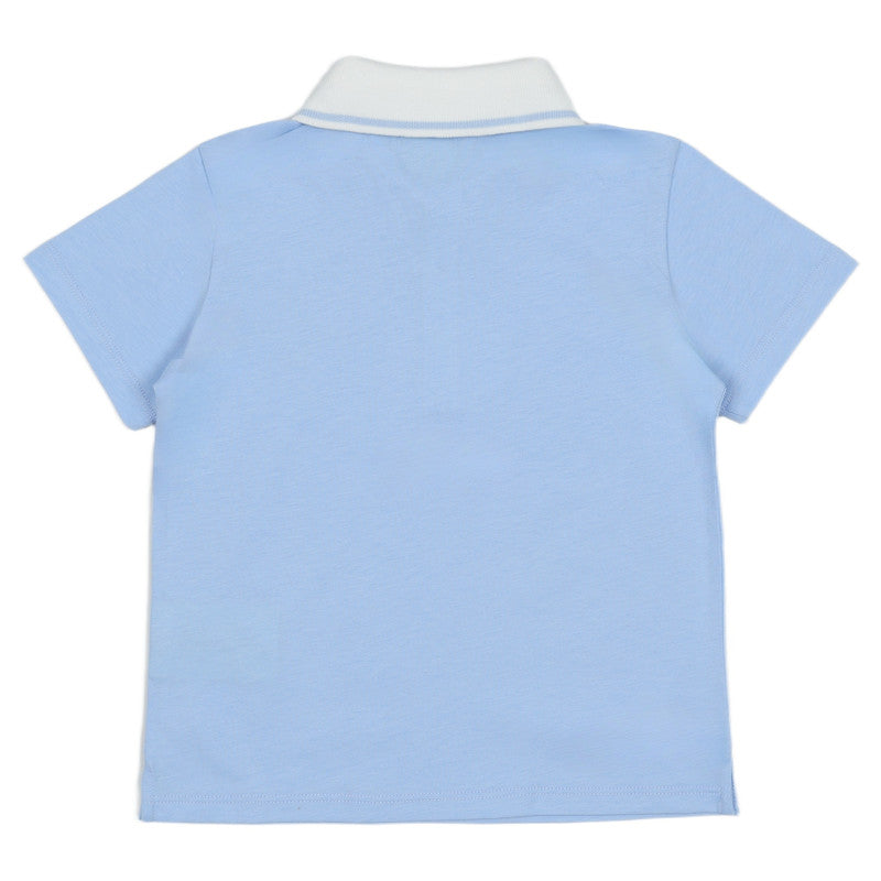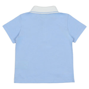 Classic light blue polo shirt for little boys by Fendi, made in soft cotton jersey. It features a single pale blue stripe on the white ribbed collar and a branded button placket. For instant brand appeal, an embroidered logo crest can be seen on the chest, completing the luxurious look.