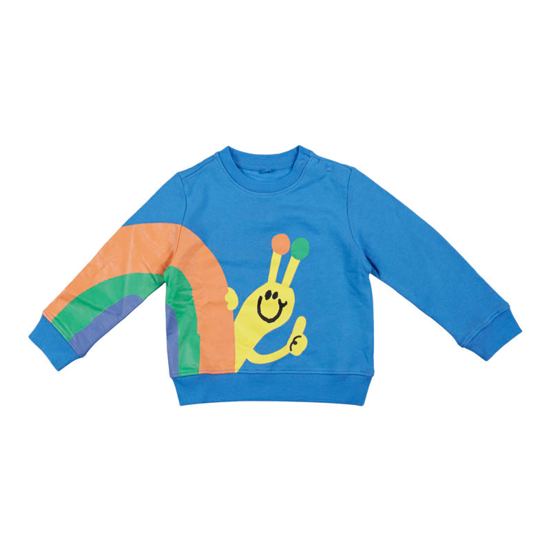 A fun, blue sweatshirt for little boys by British brand Stella McCartney Kids, made in mid-weight, organic cotton jersey. Decorated with a friendly, smiling snail on the front, it has a crew neckline with comfortable ribbed trims. It has a fleecy inside for added warmth and useful popper fastenings on the shoulder for easy dressing.