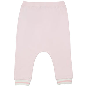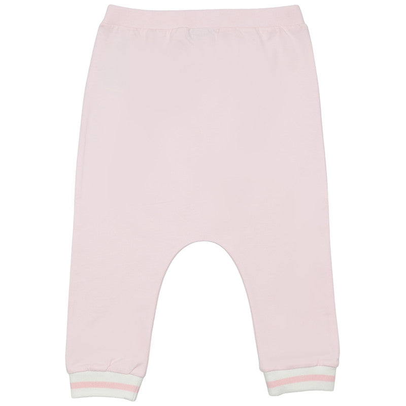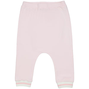 These soft pink baby joggers feature a comfortable elastic waistband and a relaxed drop-crotch fit. The design is finished with striped ribbed cuffs in white and pink for a sporty touch.