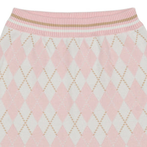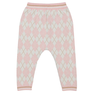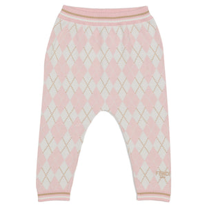 These knit Fendi baby pants feature a charming pink and white argyle pattern. With a comfortable stretch waist, they are a stylish luxury essential.