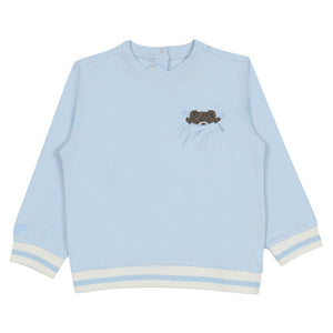 Light Blue sweatshirt by luxury brand Fendi, made in soft cotton jersey. Combining playful charm with comfort, it has a delightful Fendi bear motif on the chest and signature Fendi Roma embroidery on one sleeve. There are sporty striped trims and useful popper fastenings on the back to help with dressing.